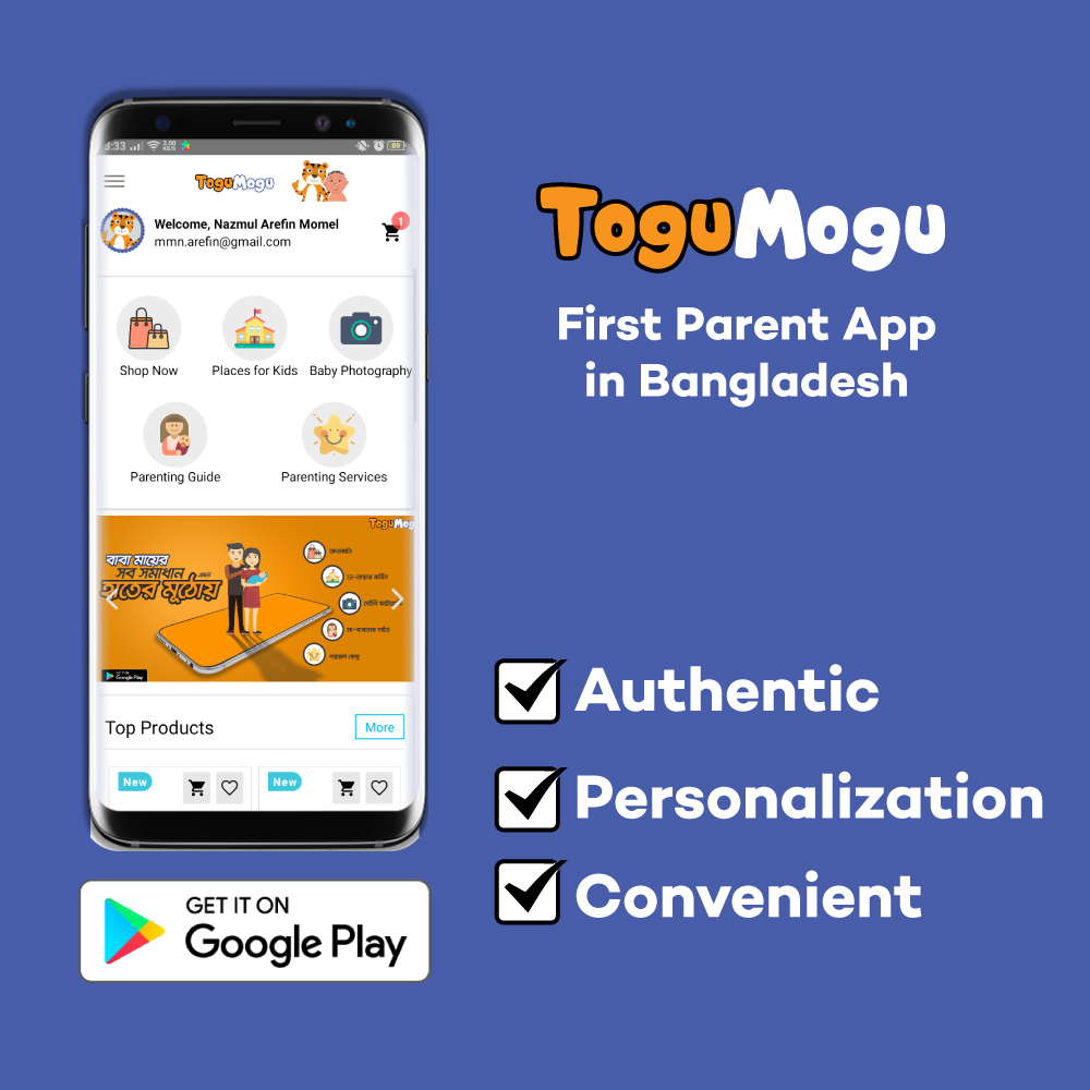 মা-বাবার জন্য এখন Togumogu নিয়ে এসেছে বাংলাদেশের প্রথম Parenting app.যার মাধ্যমে প্রেগনেন্সি থেকে শুরু করে ১২ বছর পর্যন্ত শিশুর সকল ধরনের প্রোডাক্ট এবং সার্ভিস পেয়ে যাচ্ছেন একটি App এ। অভিভাবকের জন্য রয়েছে বিভিন্ন আর্টিকেল যা আপনার সাথে শিশুর বেড়ে উঠাকে করে তুলবে আরও সহজ এবং নিরাপদ। শিশুদের Moral Values বা নৈতিকতা বোধ শিক্ষার বিভিন্ন বই খুব সহজেই পেতে পারেন এখানে।
